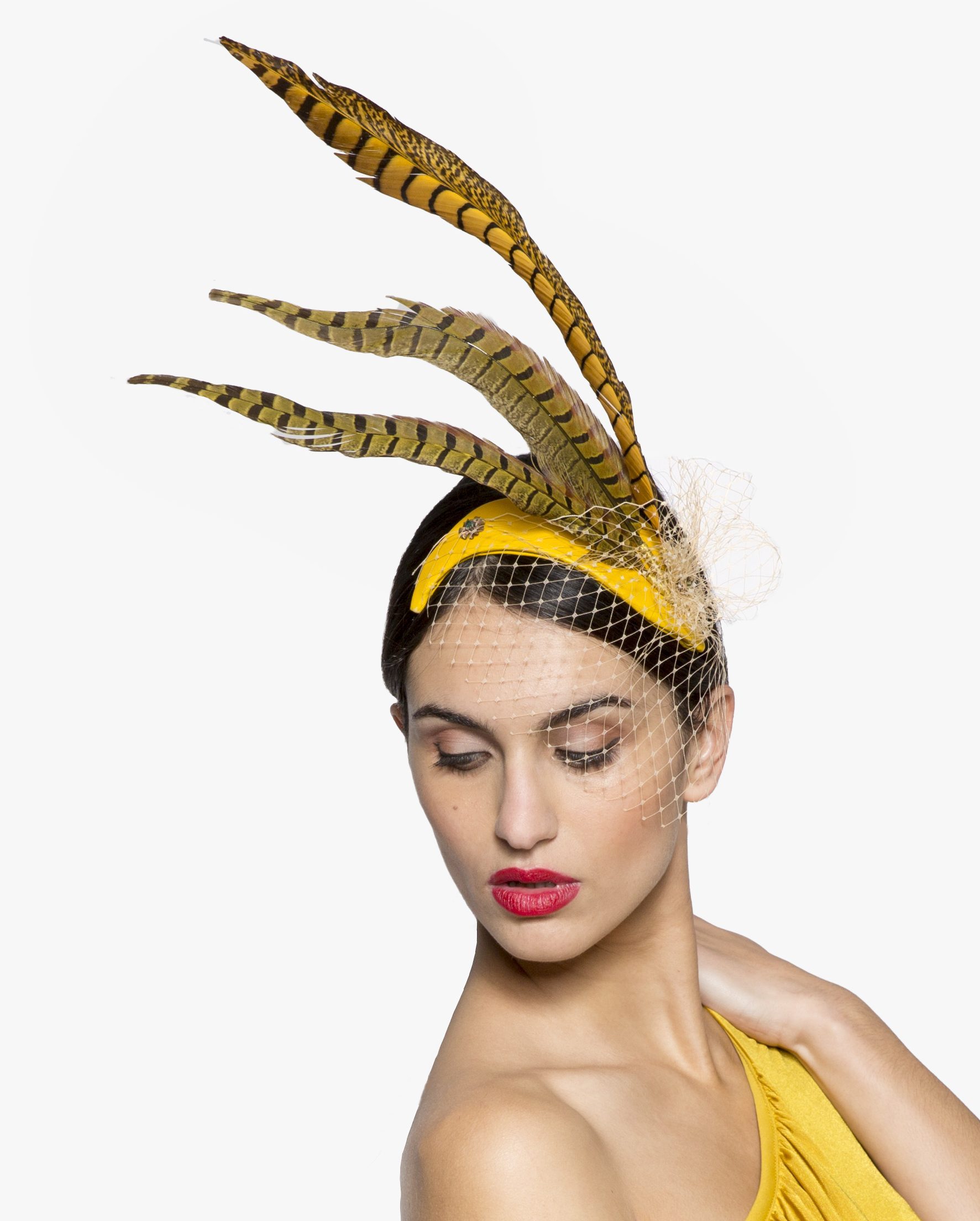 Se trata de un toque con base en forma de lágrima forrada con cuero mostaza y adornado con unas plumas de faisán al tono.