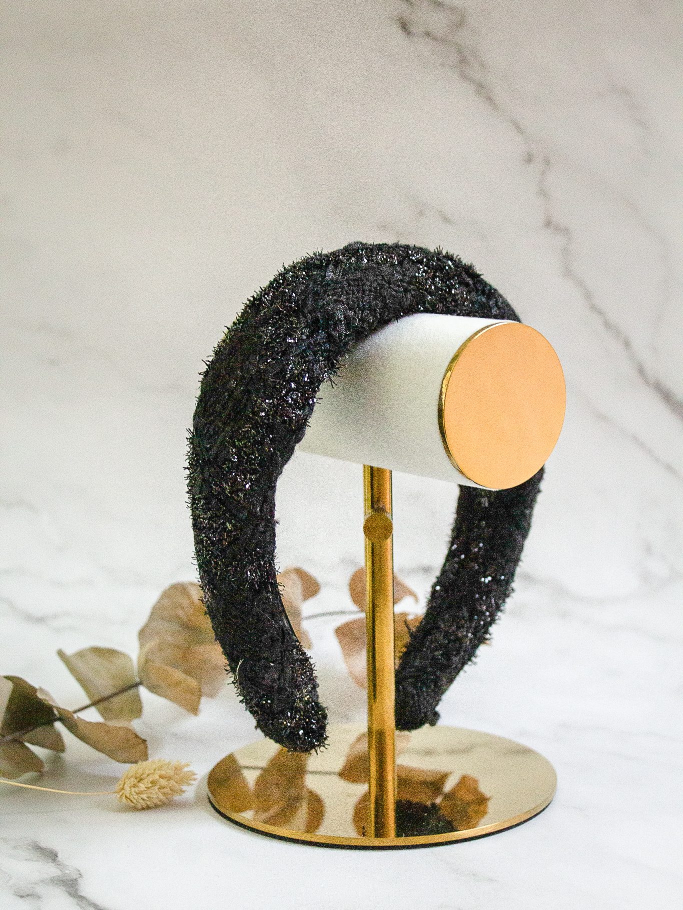 Diadema ancha estilo Chanel, confeccionada en un exclusivo tweed de color negro con entramados de hilos de lurex y lana.